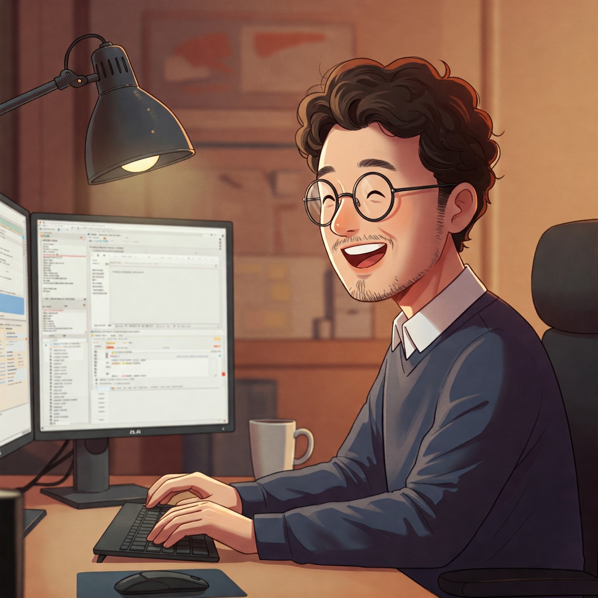 40대 중반의 한국인 이면서 짧은 곱슬 머리에 이마가 넓고 동그란 안경을 쓴 개발자가 듀얼 모니터 책상에 앉아 일에 집중하면서 행복해 하는 그림을 만화 풍으로 그려줘