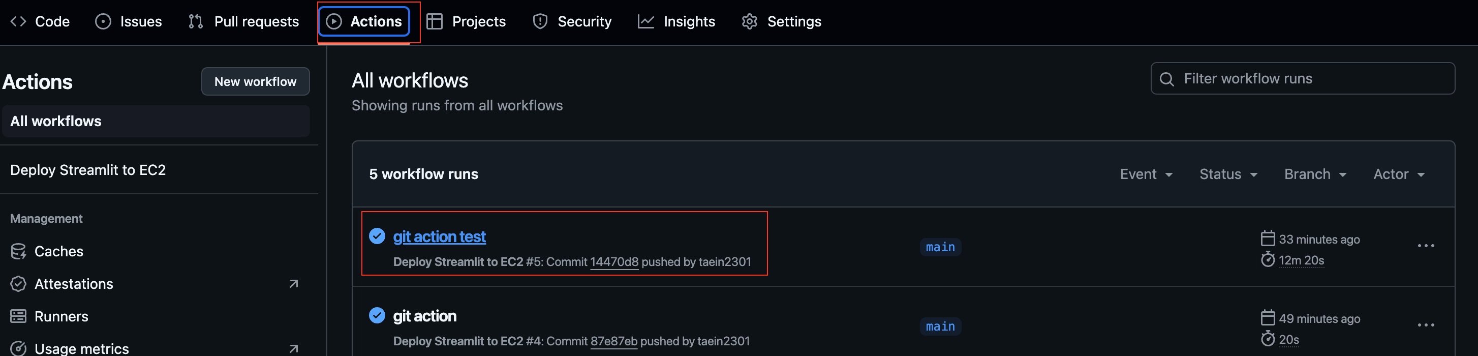 - ssh 명령어: EC2에 접속해 코드를 클론하거나 업데이트하고, Streamlit을 백그라운드에서 실행.